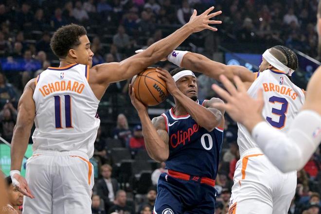 从太阳转会到快船,比尔也算是面对老东家了,但还是难有起色。上半场比尔投篮3中1,仅拿到2分1篮板1助攻的数据,正负值-8全队最低。